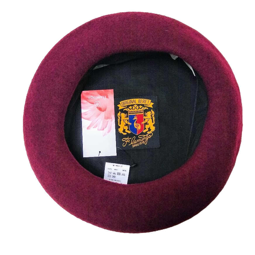 The Flamingo Chobo400 models are exclusively made for South Pacific Berets. Based on the W400 model, these berets measure 31cm in diameter and are fitted with a satin lining, the Flamingo Basque woven label, the trademark Flamingo size-adjustable headband and a chobo.