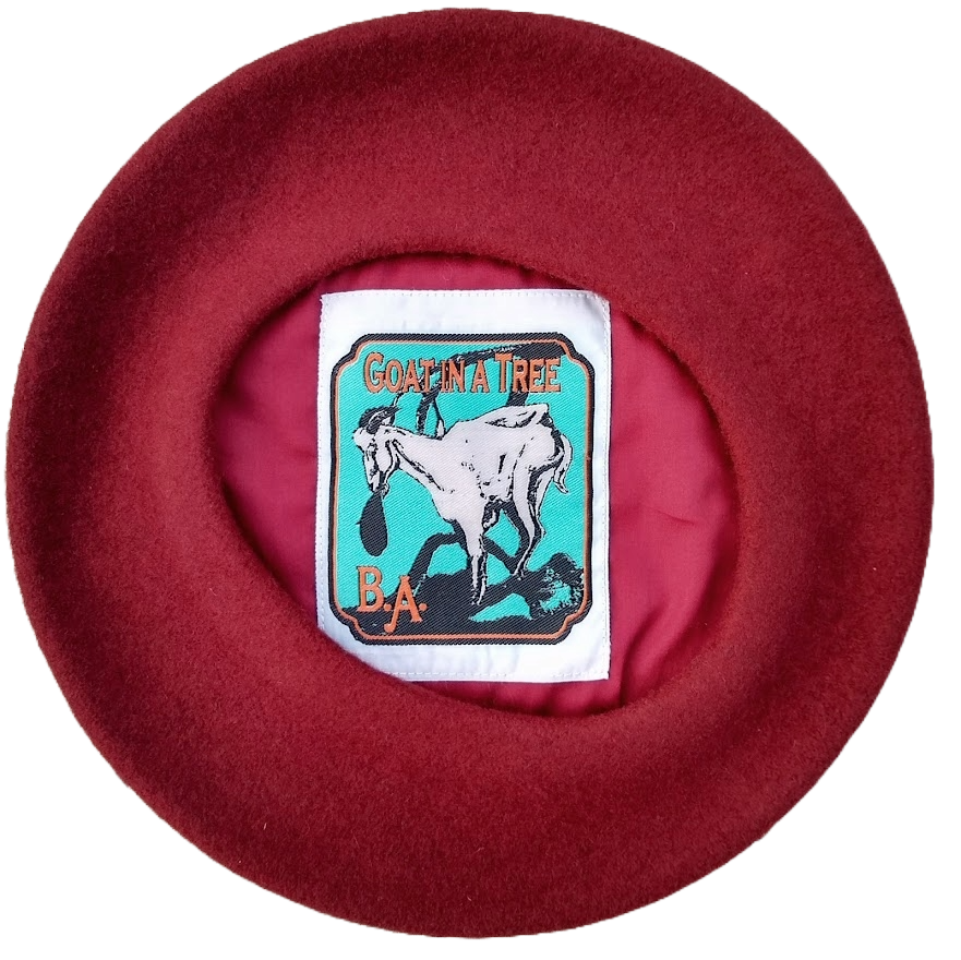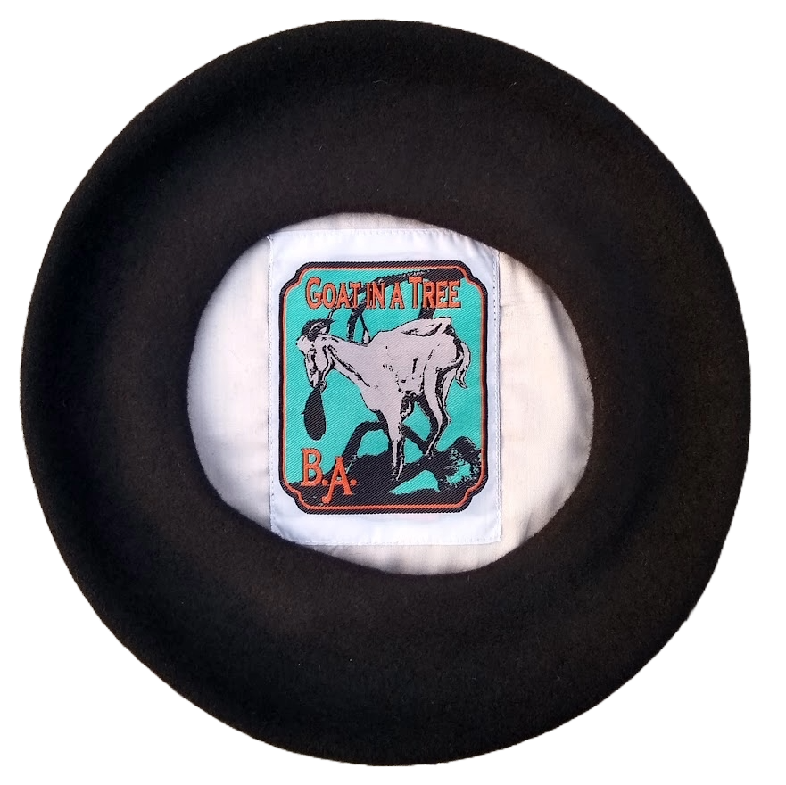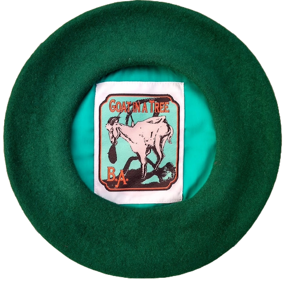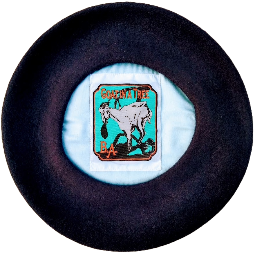 These berets are made in a small batch of 100% merino wool or cotton, fitted with a sewn-in cotton lining and the woven Billy Childish 'Goat in a Tree' label.